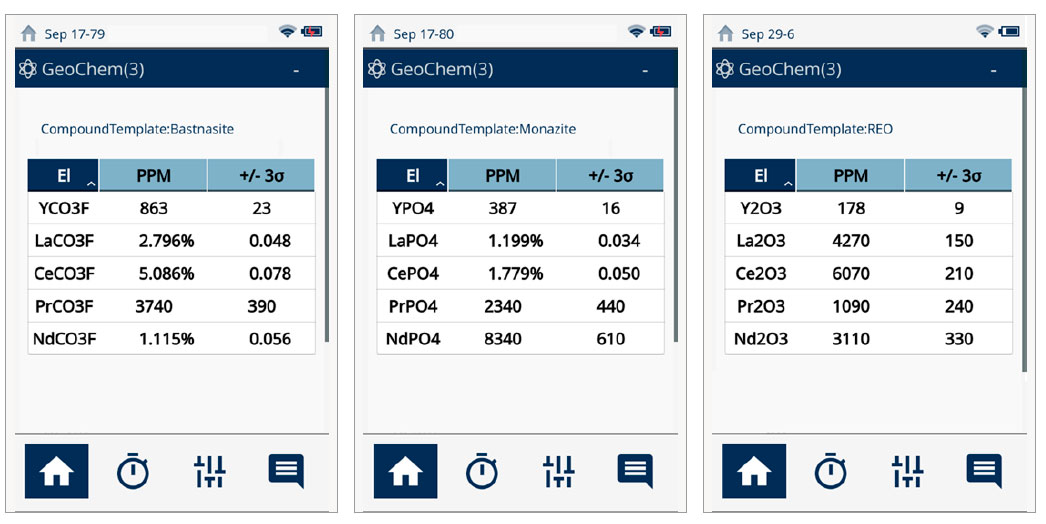 雖然稀土元素在技術(shù)上并不“稀有”,但它們通常不會(huì)像金(Au)或其他礦物那樣以高含量的礦脈形式存在。因此對(duì)稀土礦石的識(shí)別和開(kāi)采非常困難。此外,稀土礦石的加工是一項(xiàng)較為獨(dú)特、主要是化學(xué)工程的任務(wù),遠(yuǎn)比加工金和賤金屬礦石復(fù)雜。Vanta手持式XRF光譜儀可以檢測(cè)低至兩位數(shù)ppm水平的稀土金屬,是在現(xiàn)場(chǎng)快速識(shí)別這些寶貴元素的理想工具。此外,Vanta光譜儀可以在野外計(jì)算稀土氧化物的含量,如下圖所示。圖2.