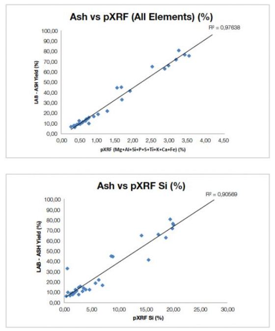 圖1. 奧林巴斯手持式XRF光譜儀獲得的數(shù)據(jù)與經(jīng)認證的參考材料額定值之間有著密切的關(guān)聯(lián)性,因此使用組合輕元素替代物(Mg+Al+Si+P+S+Ti+K+Ca+Fe)或僅使用二氧化硅可以有效地估算灰分含量。如果元素組中的元素更全,還可以獲得更好的結(jié)果。
