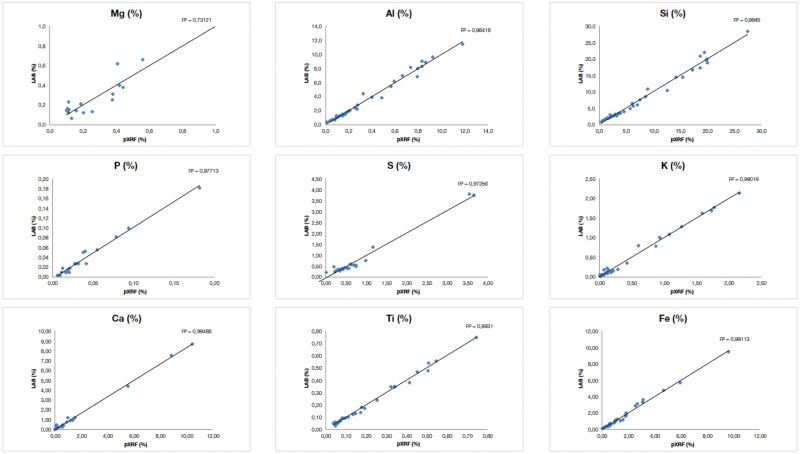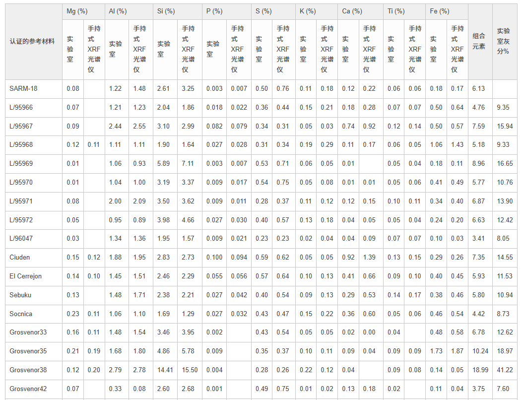 圖2. 奧林巴斯手持式XRF光譜儀檢測大量煤認證參考材料(CRM)獲得的結(jié)果與這些材料的標稱值高度吻合。上面的圖表表明對于重要元素:Mg、Al、Si、P、S、K、Ca、Ti和Fe,實驗室認證值和XRF分析儀獲得的數(shù)據(jù)值在準確性和精確性方面都表現(xiàn)出高度的一致性。 數(shù)據(jù)表包含了繪制這些圖表所依據(jù)的實驗室數(shù)據(jù)和XRF數(shù)據(jù)。數(shù)據(jù)承蒙新南威爾士大學生物和地球科學學院提供 - ACARP項目。
